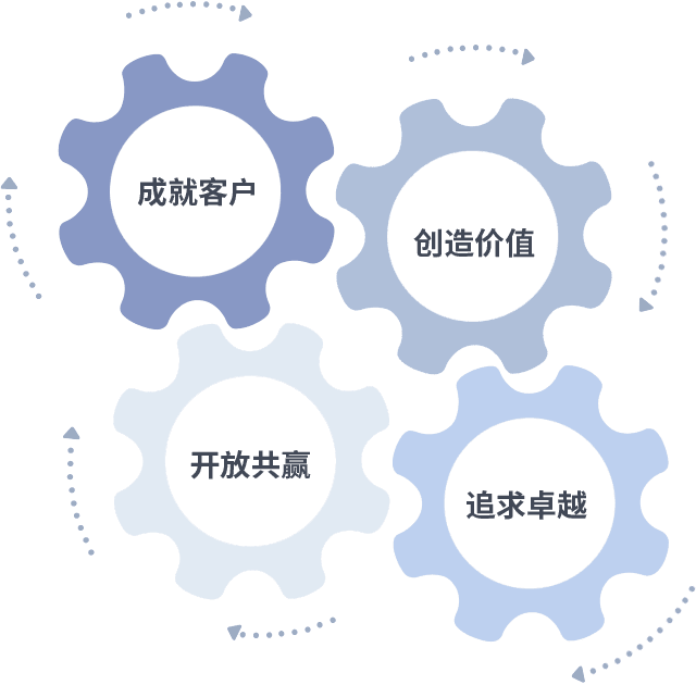 成就客户是一切决策的出发点,,,,创造价值是衡量所有工作的标准,,追求卓越是我们做事做人的态度,,开放共赢是我们的格局也是最终的结果。。。价值观的齿轮环环相扣,,,,推动着组织里的每个人不断向前。。。