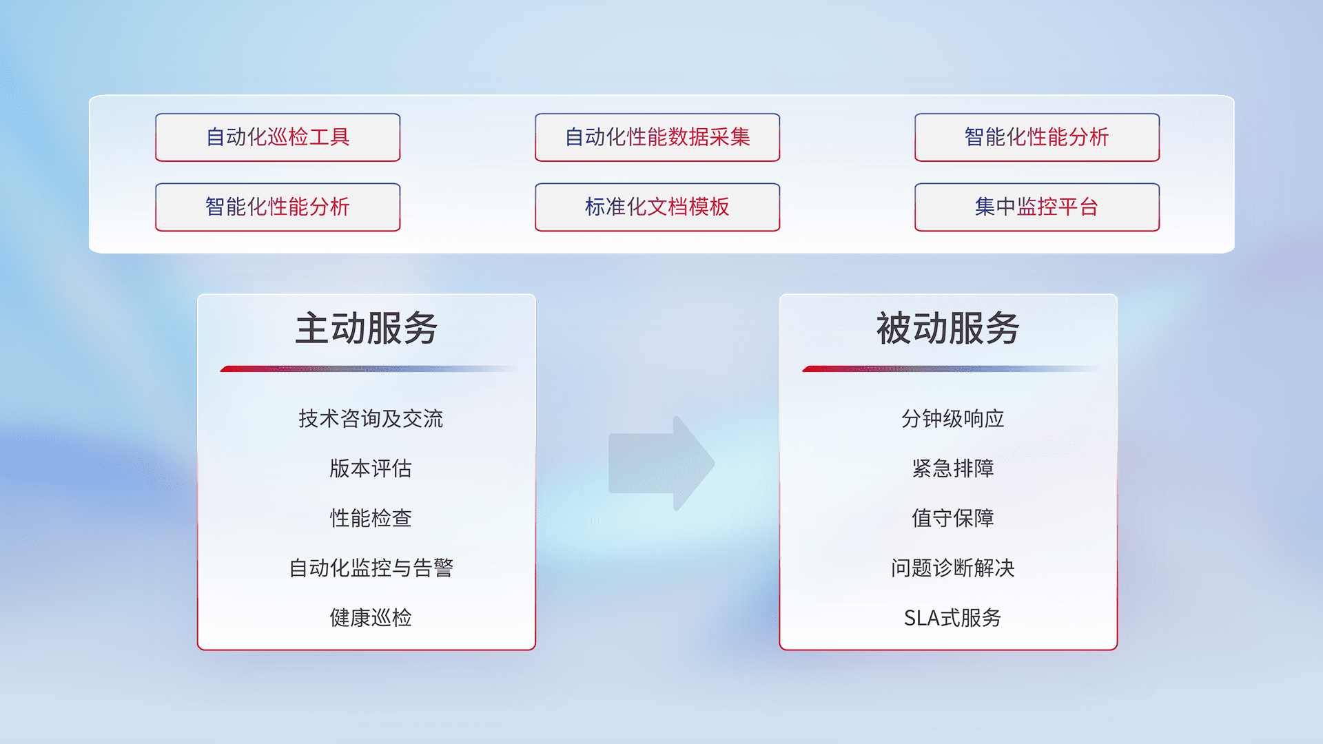智能化工具和标准化文档,,,保障服务质量,,,提供主动服务(包含技术咨询、、、版本评估、、、性能检查、、、、自动化监控与告警、、、、健康巡检)和被动服务包含(分钟级响应、、、、紧急排障、、、、值守保障、、问题诊断解决、、、、SLA服务)。。。。