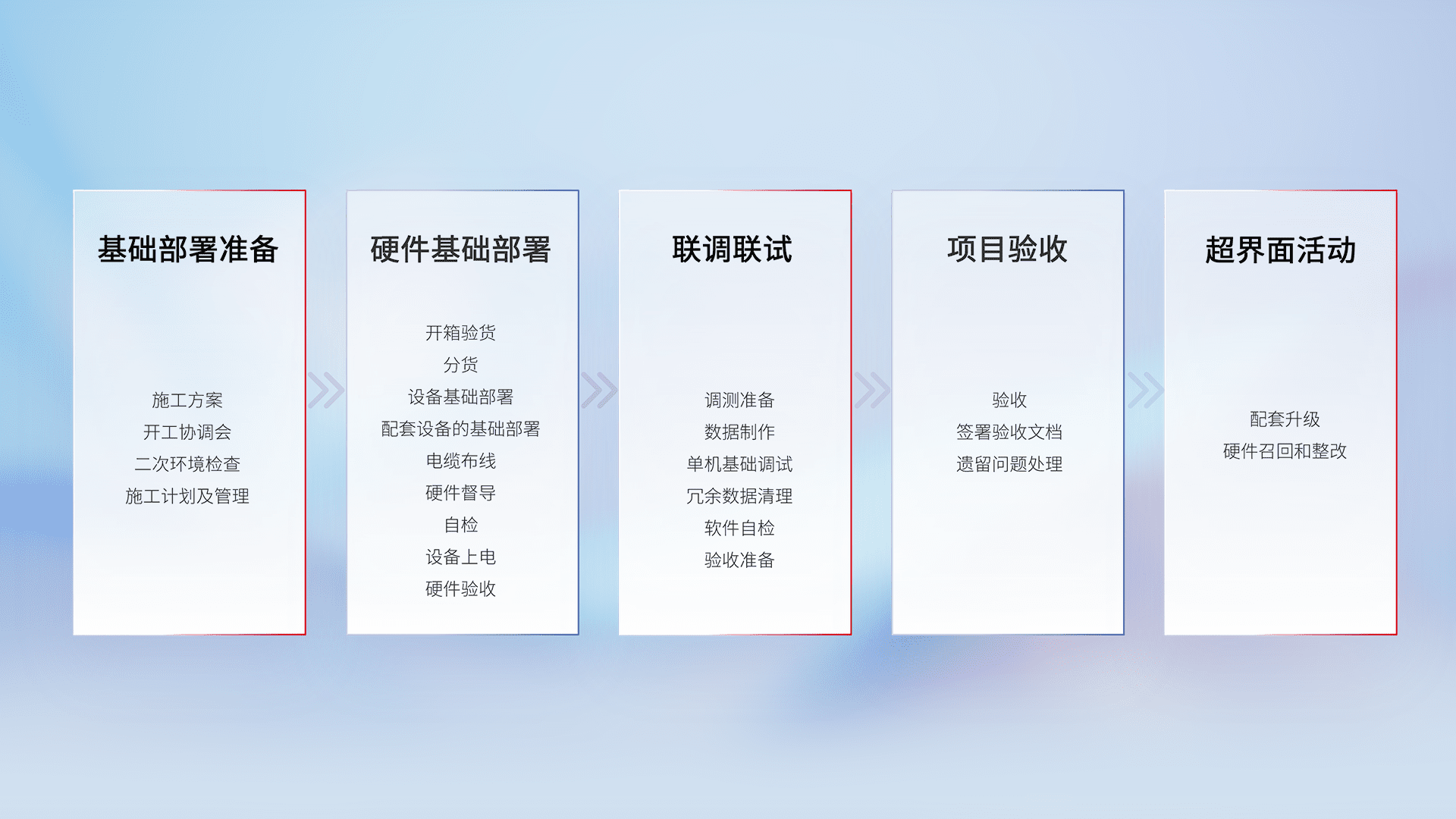 从基础部署准备、、、硬件基础部署、、、联调联试、、、、项目验收、、越界面活动的全过程可追溯,,保证施工质量和进度。。